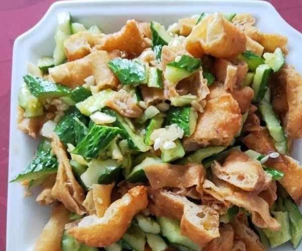 黃瓜拌油條食材:鮮黃瓜、剩油條、大蒜、醋、香油