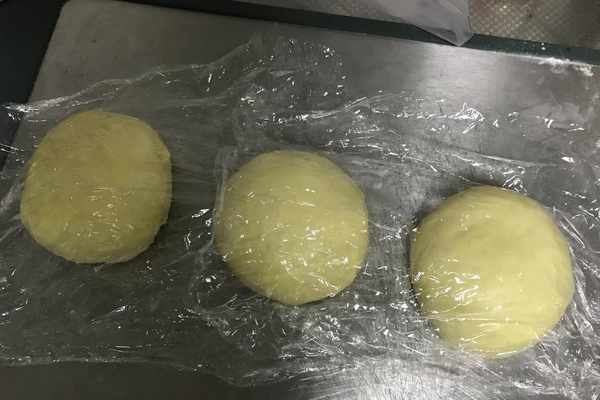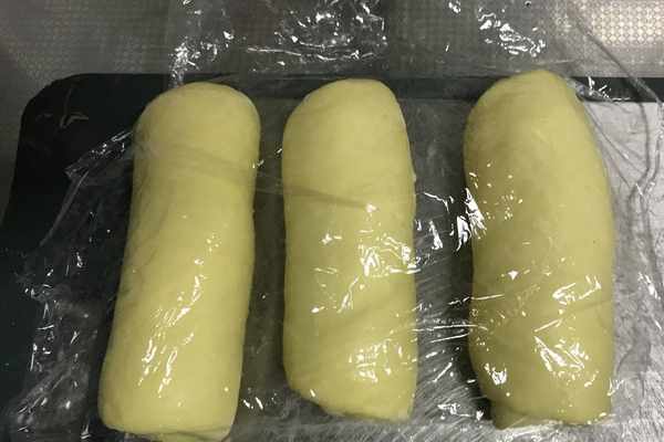 9、依次將三個面團分別如上述所操作,蓋好保鮮膜,醒發15分鐘,如圖所示。