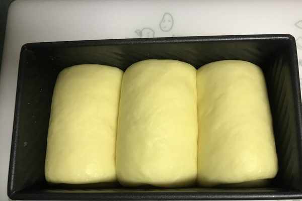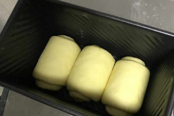 13、將其在模具中的面卷第二次進行發酵至約為模具的八分滿,如圖所示。