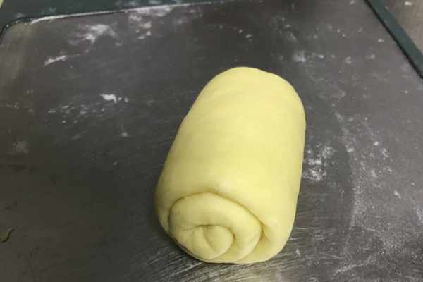 10、將上述卷過一次的面卷,再次用搟面杖將其搟成長條,如圖所示。
