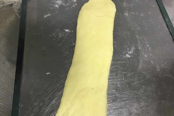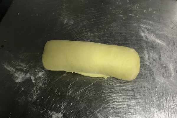 7、按照滾圓的操作順序,將分好的面劑子,用搟面杖搟成一個長條,如圖所示。