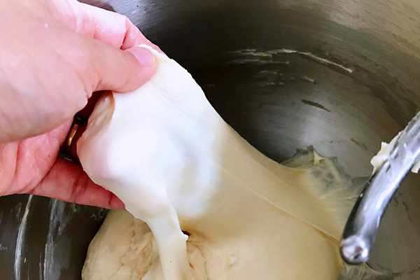 3、在上述狀態後,可以加入軟化的黃油和鹽,繼續將其混合揉成一個用手撐開後,其面膜是一個非常薄,而且很有韌性且不容易破的狀態,如圖所示,說明面團揉制好瞭。