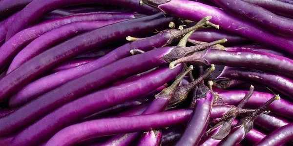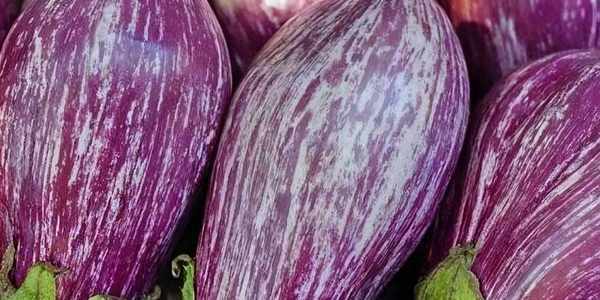 第三種是花茄子,市場上比較少見,它是由荷蘭引進的品種,紫、白相間的條紋非常清晰漂亮,花茄子的皮要薄一些,肉質肥厚、緊實、細膩,纖維少,較好嚼,吃到嘴裡面有一種吃肉的感覺,滑嫩、細膩而且有點彈牙。適合蒸,炒,涼拌,紅燒等。
