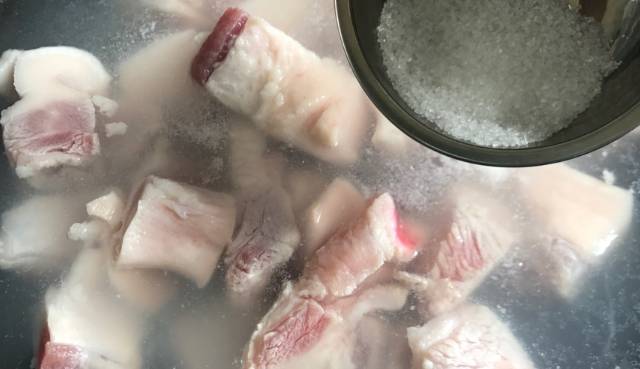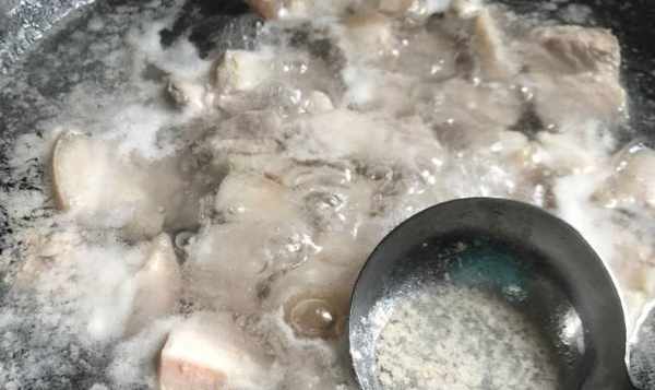 3、鍋裡面加入適量的清水,冷水下鍋,把五花肉焯水,大火將鍋裡面的水燒開瞭以後加入適量的白糖,這樣焯水之後出來的豬肉肉質很有彈性哦。把煮出來的浮沫撇去。