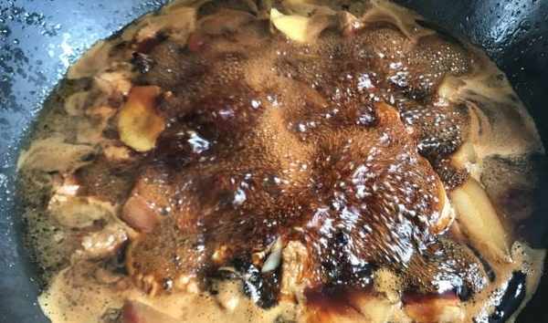 7、直到將五花肉的肉皮炸的金黃色即可,再將老抽,花雕酒,冰糖,生抽,八角,大蒜。薑片還有五香粉上都下進鍋裡面。加入少量的肉湯,湯的分量就正好可以沒過五花肉為準。
