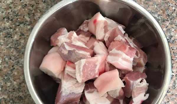 2、五花肉清洗幹凈,然後再切成5厘米左右的方塊,五花肉最好是準備我這樣帶皮的五花肉,這樣做出來非常的好吃。