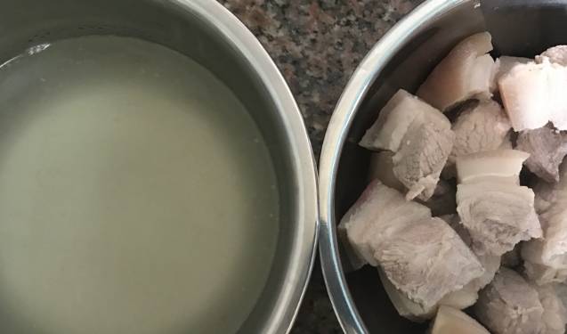 4、將五花肉撈出來再用溫水清洗一下,然後五花肉焯好的水不要扔掉,把浮沫處理幹凈瞭備用。