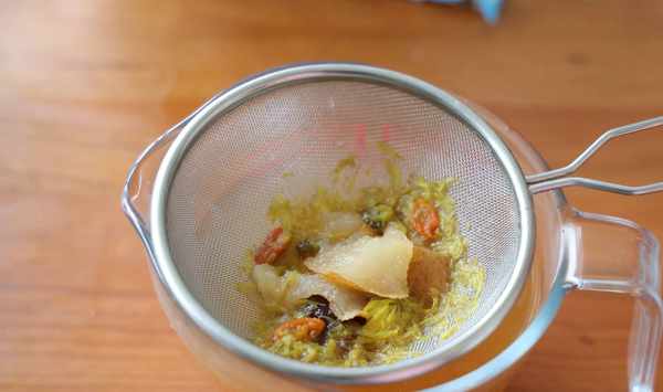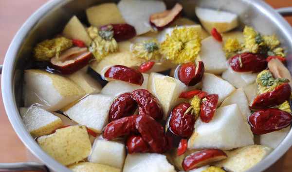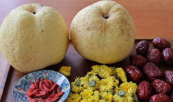 制作配料:雪梨2個紅棗1大把菊花1把枸杞適量冰糖1塊