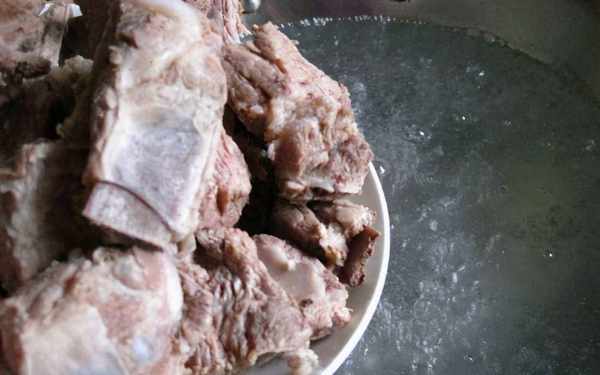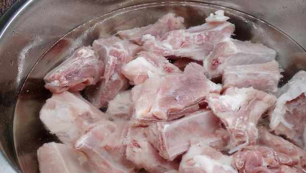 第一個步驟,把新鮮排骨剁小塊後,放在一個大一些的盆中,加足量涼水,讓排骨在水中泡一泡,至少泡一個小時,在泡的過程中換兩三次水。這麼做的目的是讓排骨內部的血水滲進水中,達到去血水去腥味的效果。