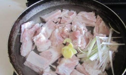 第二個步驟,把排骨洗凈後放進鍋內,加入沒過排骨多一些的水,再放幾片生薑,開大火煮到沸騰,在煮的過程中,水面出現的臟東西用鏟子去掉,再撈出排骨放溫水裡清洗控水待用。