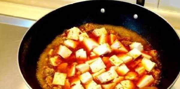 3、炒香以上材料後倒入清水煮開。然後放入適量的醬油,下入豆腐煮開。煮大約3-5分鐘後放入少許雞粉提鮮。