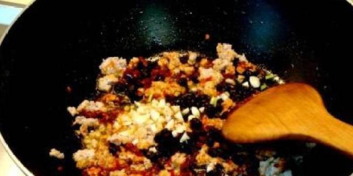2、炒鍋上火燒熱,註入適量花生油便炒肉末。肉末變色後下入郫縣豆瓣醬、豆豉、蒜末、黃酒煸炒、炒勻。