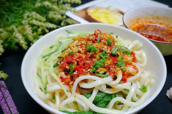 6、將面條煮熟,撈出過一下涼開水,撈到碗裡,澆上兩三勺黃瓜青椒開吃啦。