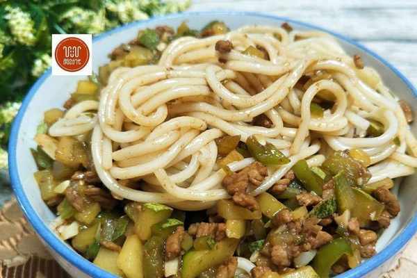 食材:黃瓜1根、青椒4根、豬肉適量、蒜末適量、鹽1勺、淀粉1小勺、生抽2勺、料酒1勺、醬油1勺、鮮面條適量。