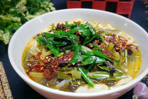6、面條撈出碗中,加入熗過的漿水,根據口味,加鹽,生抽辣椒油調味。