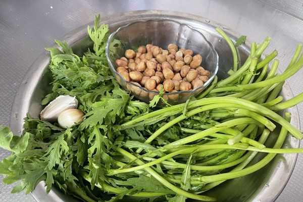 所需食材:茼蒿1把、花生半碗、蒜2瓣、白芝麻1勺、熱油2勺、生抽1勺、蠔油1勺、醋半勺、白糖半勺、鹽少許。