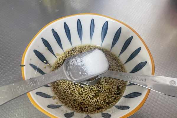 5、制作一碗料汁:蒜末、白芝麻,淋入熱油,攪拌均勻,再加入生抽、蠔油、醋、白糖、鹽,拌勻。