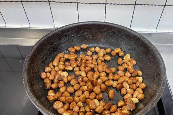4、炒花生:鍋中加入1勺食用油,再加入花生,開小火,一直翻炒至花生變熟,放入盤中晾涼。