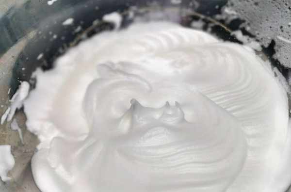 3、蛋白倒入無水無油的打蛋盆中,滴入幾滴,倒入30克白糖,打蛋器開中低速打發,直到提起打蛋器蛋白霜呈直立的小尖角狀即可,全程用時大概2分鐘左右,要留意觀察蛋白的變化過程,切記千萬不要打過頭。