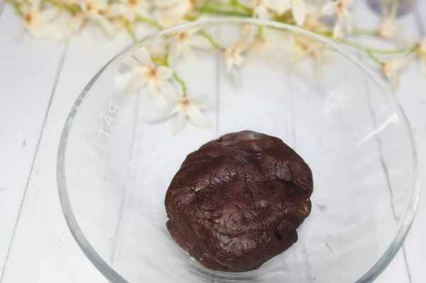 1、黃油提前從冰箱拿出軟化,過篩入低筋面粉、玉米淀粉和可可粉,將過篩的所有食材和黃油稍微攪拌,再加入白糖和蛋黃,攪拌攪拌下手揉成一個光滑面團,蓋上蓋子醒發10分鐘。