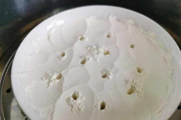 1、選一個淺口的大碗或平盤,可以增加面粉的受熱面積,平鋪上適量普通面粉,用小勺子稍微緊實,再用筷子紮上幾個散熱小孔,蓋上保鮮膜放入蒸鍋中,蒸鍋中的水要一次性添夠量,全程開中大火蒸20分鐘。