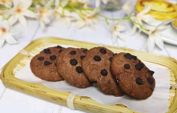 食材:低筋面粉70克、玉米淀粉30克、黃油45克、可可粉15克、白糖15克、雞蛋1個(隻取蛋黃)、耐高溫巧克豆力少許。