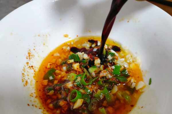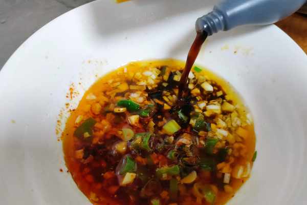 2、依次加入:生抽、米醋,拌勻成料汁。