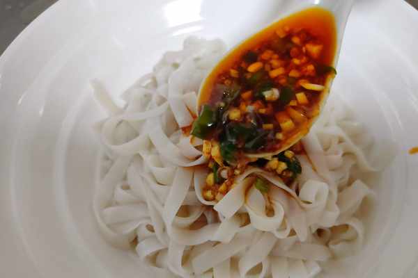 3、米粉泡軟煮熟,過涼水,放入大碗中,澆上料汁。