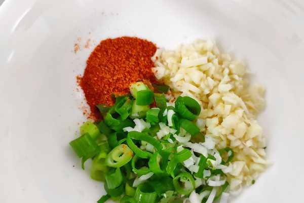 1、取一個空碗,放入蔥花、蒜末、辣椒粉,澆上熱油。