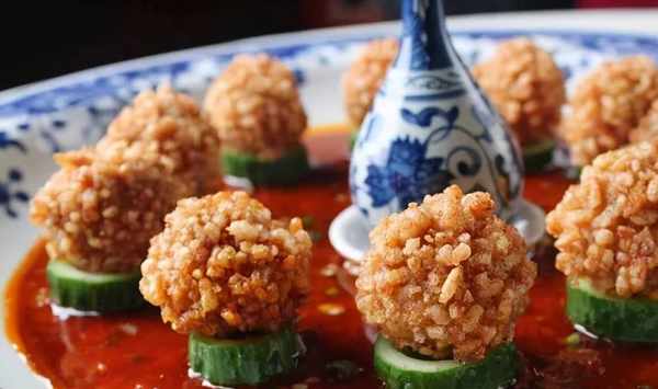 2.鍋入色拉油燒熱,把肉茸擠成丸子並粘勻鍋巴碎,下入油鍋炸至外酥內熟時,撈出來瀝油,擺在黃瓜節上,最後澆上炒熱的魚香汁便成。