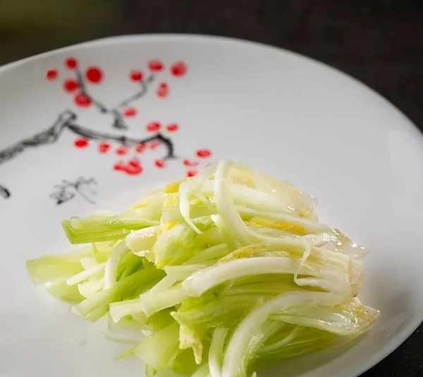 1、將芹黃擇凈,用冰水浸泡15分鐘,瀝幹後手撕成段,加魚露、醬油、蔥油拌勻,碼盤做造型即可。