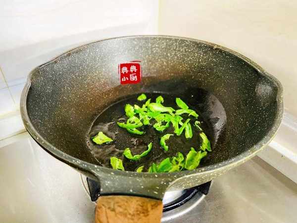 起油鍋,把青椒先倒進去翻炒至斷生。