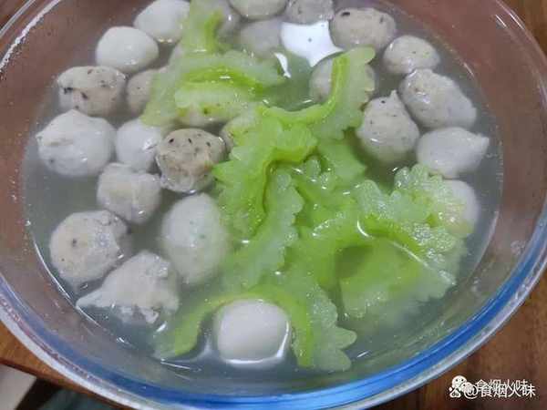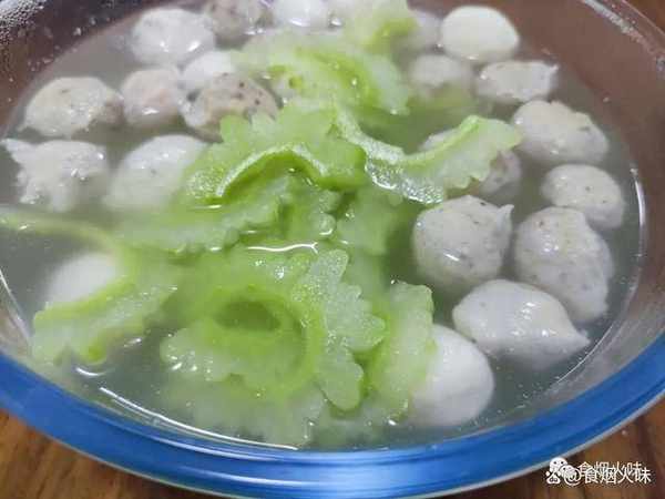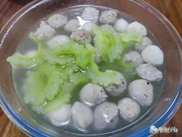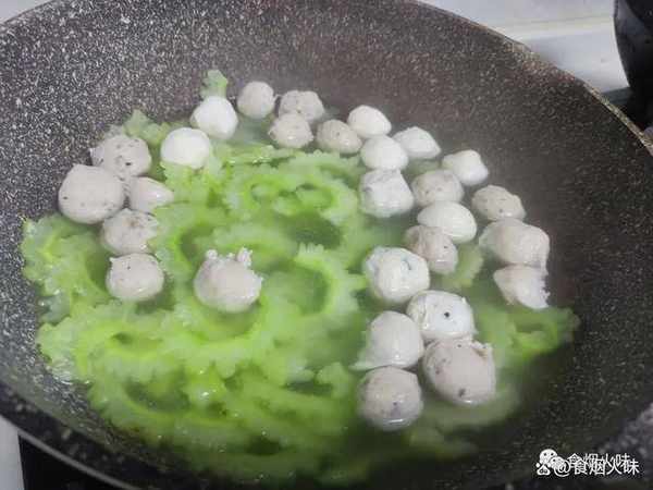 2.備好的丸子用清水洗凈,洗凈後的丸子放在一旁。準備一個幹凈的鍋,鍋中倒入水,然後放入丸子。丸子一般是速凍的,直接跟水一同下鍋煮。鍋裡面的水煮開瞭,丸子也煮得差不多,我們就把備好的苦瓜放入鍋裡面,加入一小勺的食用油。食用油可以保持苦瓜的翠綠,接著再放上適量的食鹽,用勺子攪拌均勻放著。