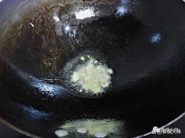 3.蒜洗凈去皮,去皮後的蒜瓣放在案板上,用刀將其拍碎,拍好後的蒜瓣切小丁狀放在一旁備用。鍋中倒入油,然後把油燒熱,油熱瞭之後,我們就把備好的蒜泥放入油鍋中小火炒香;