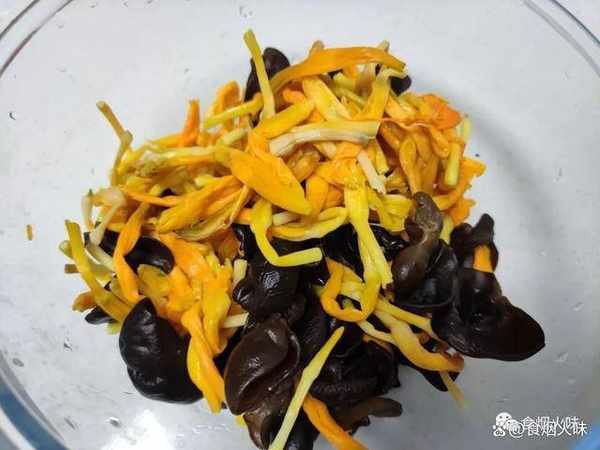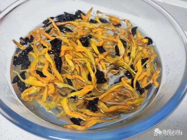 1.金針菜跟木耳都是幹貨,所以我們在煮之前要先將它放入溫水中浸泡。這種是屬於金針菜,跟平時我們看到的那種黃花菜其實也差不多,但是這一種更容易泡發,泡的時間會短一點;