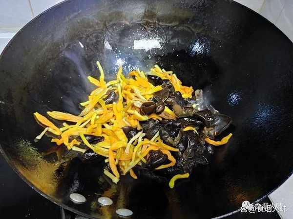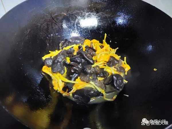 4.炒香瞭把備好的金針菜跟木耳下鍋後,用鏟子給它們翻炒,炒均勻,而且要多翻動一下,把它們炒香;