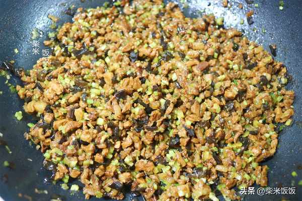 6,待肉餡冷涼,放入芹菜碎和木耳碎,再次拌勻這個餡料就調好瞭。