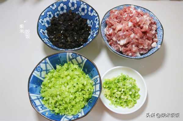 2,肥瘦二八的豬肉洗凈,切成丁。芹菜和木耳也分別切碎。再準備一些蔥末和薑末。