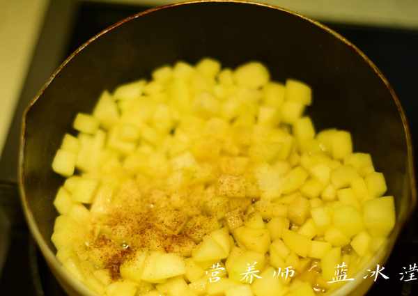 1,2個蘋果去皮切小丁,炒鍋燒熱加入10g黃油和蘋果丁,炒到變色,加入鹽,肉桂粉和20g有機楓糖燉煮5分鐘