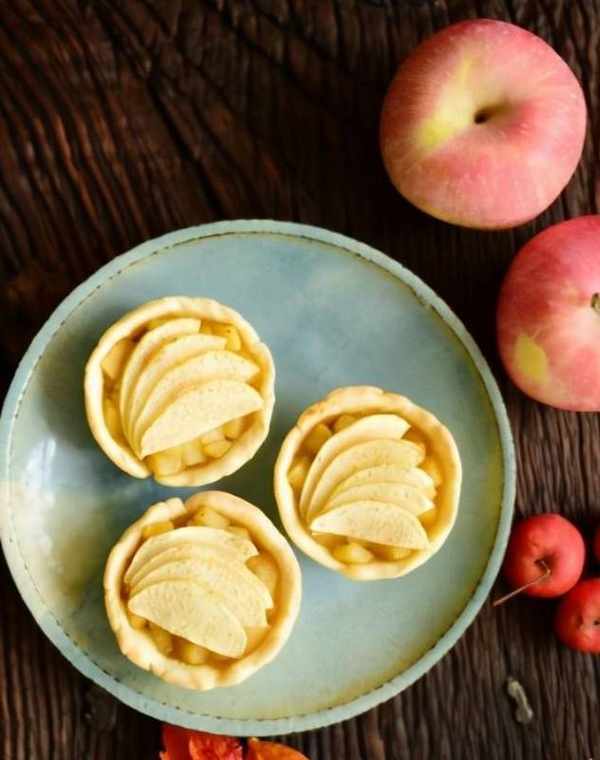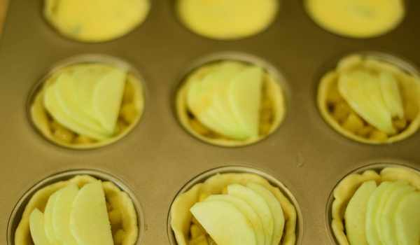 4,煮好的蘋果丁放入派皮裡,再切一個蘋果片裝飾在上面