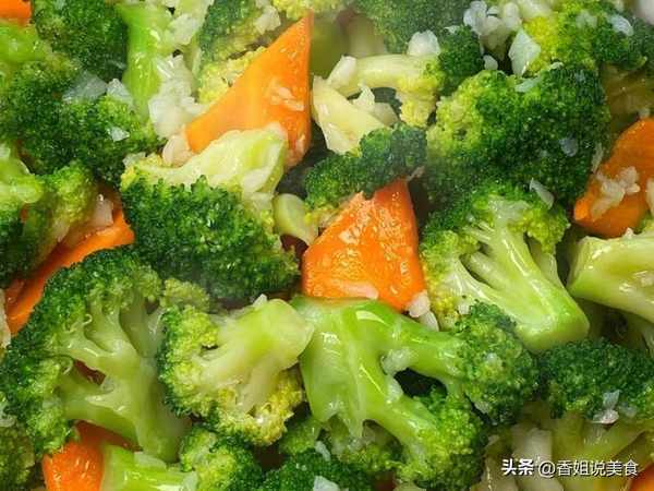 4、起鍋燒油,油熱後放入蒜末炒出香味,再放入蒜末炒出香味,然後放入胡蘿卜翻炒一會兒,炒至變色後放入西蘭花翻炒均勻。