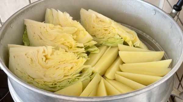 1.包菜和土豆,切船型,擺在蒸籠裡,溫水上鍋,水開計時,蒸10分鐘