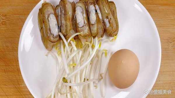 【蟶子豆芽雞蛋湯】所準備的食材有:1斤蟶子、適量黃豆、雞蛋1個、香蔥、鹽、胡椒粉、食用油、玉米淀粉、薑、香油