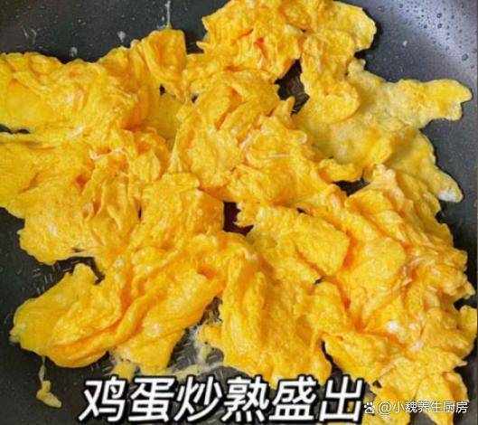 第五步:另外起鍋提前預熱,多放一些食用油,滑入調好的雞蛋液,讓蛋液煎至成型,用鍋鏟將雞蛋炒散,將其盛出備用。