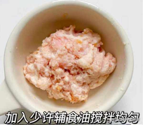 3:豬肉肉泥用食鹽醃制,加上一丟丟紅薯淀粉,加上一個雞蛋清,加上半勺生抽,加上山藥泥,滴入一些輔食油,將肉餡順時針攪拌均勻,放置一小會兒。