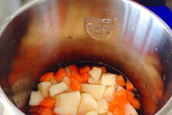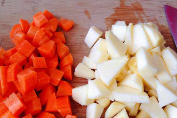 2、先把胡蘿卜切成小塊,再把蘋果去核切成小塊。