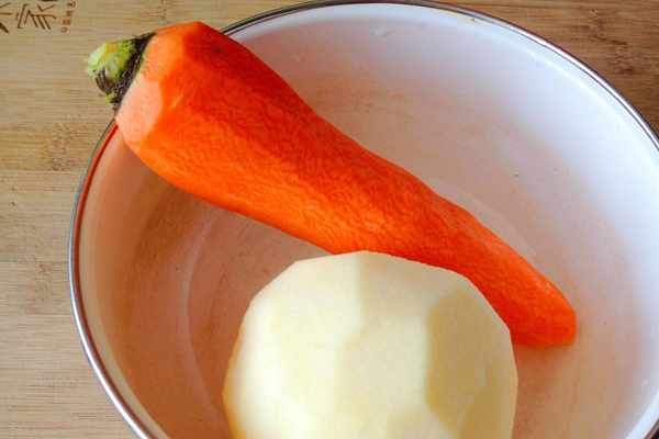 制作過程:1、首先我們要準備好制作這道【胡蘿卜蘋果汁】需要用到的食材:先把胡蘿卜和蘋果清洗幹凈,然後用削皮刀削去胡蘿卜和蘋果的外皮。