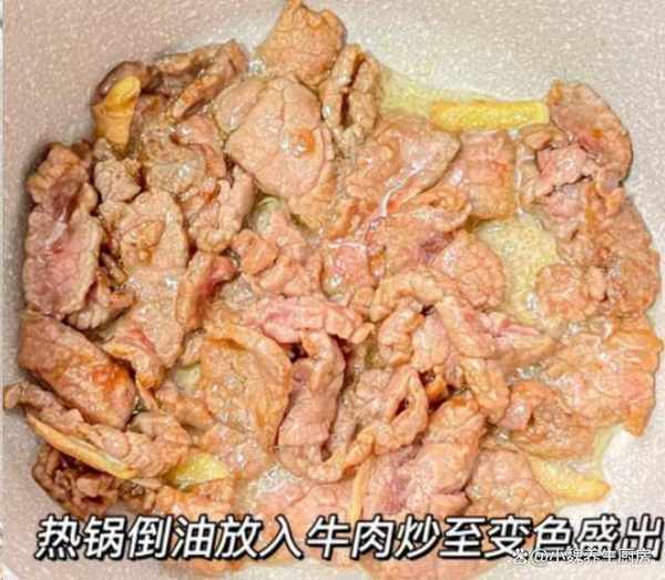 5:另外起鍋燒熱一會兒,加上適量橄欖油,滑入醃制好的牛肉片,煎至兩面都變色,將牛肉裝在碗中,備用。