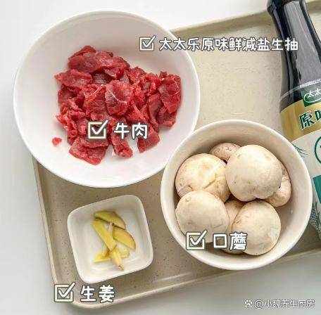 食材明細:購買新鮮的口蘑250克(口蘑是一種很鮮美的白色食用菌,菌肉非常鮮嫩,有一股淡淡的清香,我們傢喜歡炒食或煲湯,鮮嫩美味,低脂低卡,不擔心長肉長胖),購買新鮮牛肉裡脊300克左右(牛肉裡脊的肉質新鮮,價格雖然很貴,但是營養很出色,再貴也要多吃),生薑3片,適量料酒,半勺生抽和半勺蠔油,味極鮮少許,地瓜粉少許(或者選擇生粉),雞精半勺,其他。