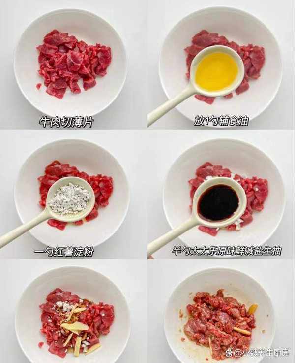 3:提前把牛肉裡脊處理幹凈,一定記得要逆紋路切成薄片,牛肉片想要口感更佳,需要去腥和醃制處理。